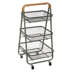 Desserte en mĂ©tal coloris vert kaki et naturel sur roulettes. Cette desserte est composĂ©e de 3 paniers mĂ©tal, elle supporte 8kg de charge par Ă©tagère soit un total de 24kg. Le haut de la desserte est en coloris effet bois mais toute la structure de la desserte est en mĂ©tal.Â